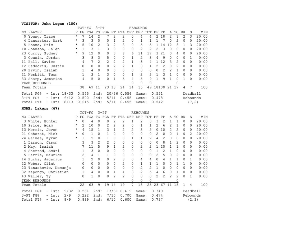 John A. Logan shot 55 percent overall, hitting 11-23 from 3-point range. The Lakers hit 35% overall, including 9-19 of 3s.