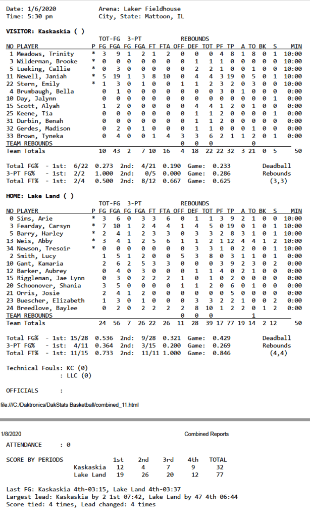 All 11 Lakers scored. Baylee Breedlove led the way with 10 rebounds, while Lucy Smith grabbed eight off the bench. Newell led the way for Kaskaskia with 19. The Lakers shot 43% overall, and hit a season best 85% from the line, going 22-26. They won the board 39-22, while forcing 21 turnovers.