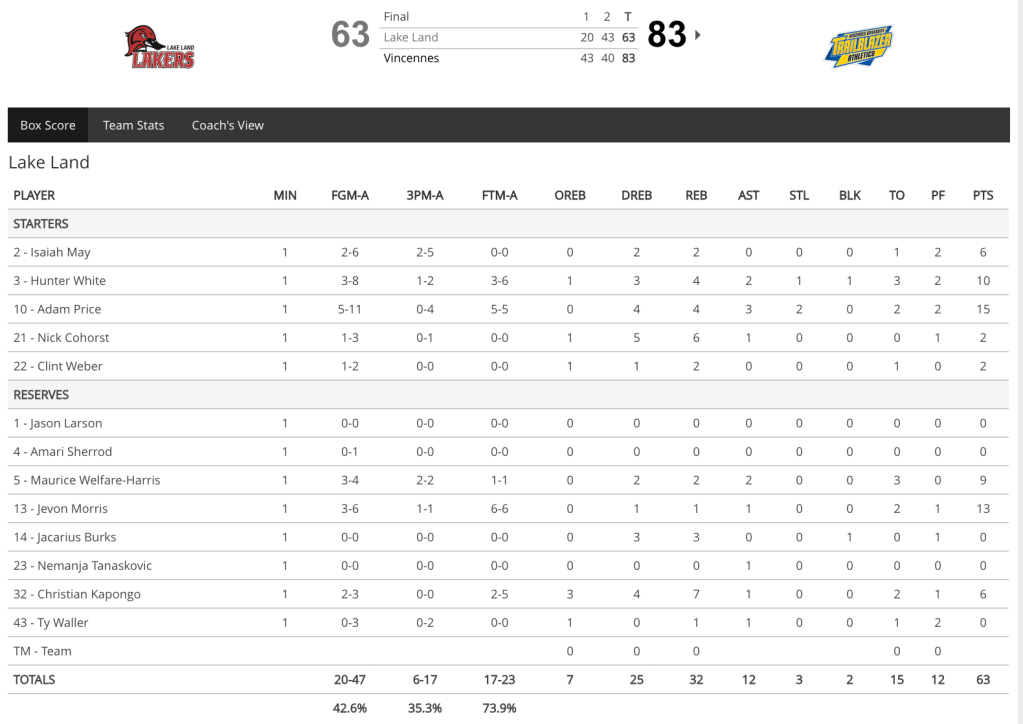 The Lakers (9-23) struggled with its shooting in the first half, hitting just 28 percent of their shots, compared to 53 percent for Vincennes. Both teams struggled on 3-pointers, combining to go 4-19 (21%) from beyond the arc. The Lakers hit 5-8 from the free-throw line.