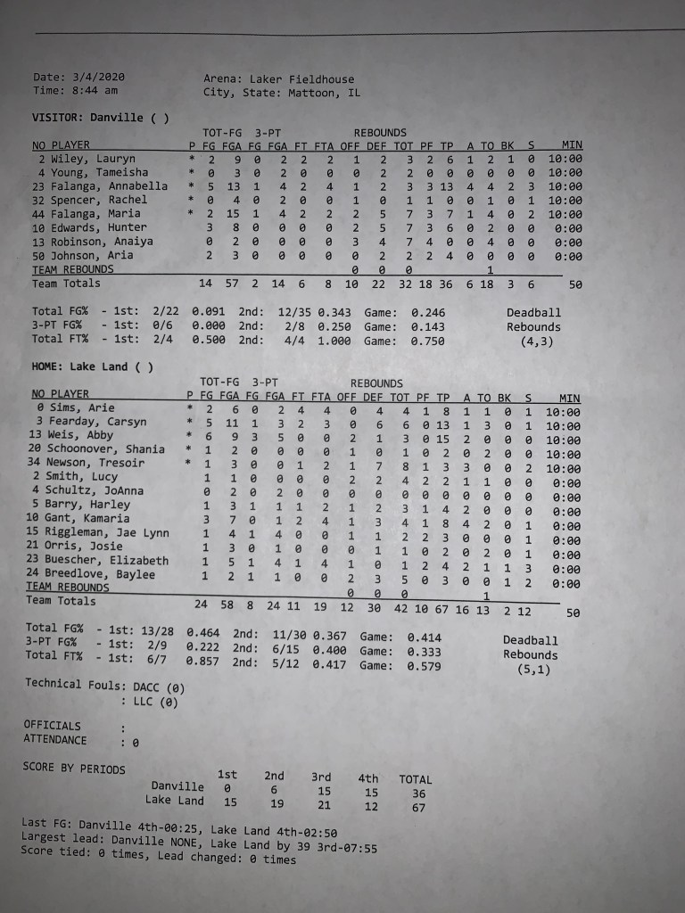 Lake Land held Danville to 24 percent of its field goals on 14-of-57 shooting from the field. The Lakers also dominated in the board, snagging 42 total rebounds to Danville’s 22.