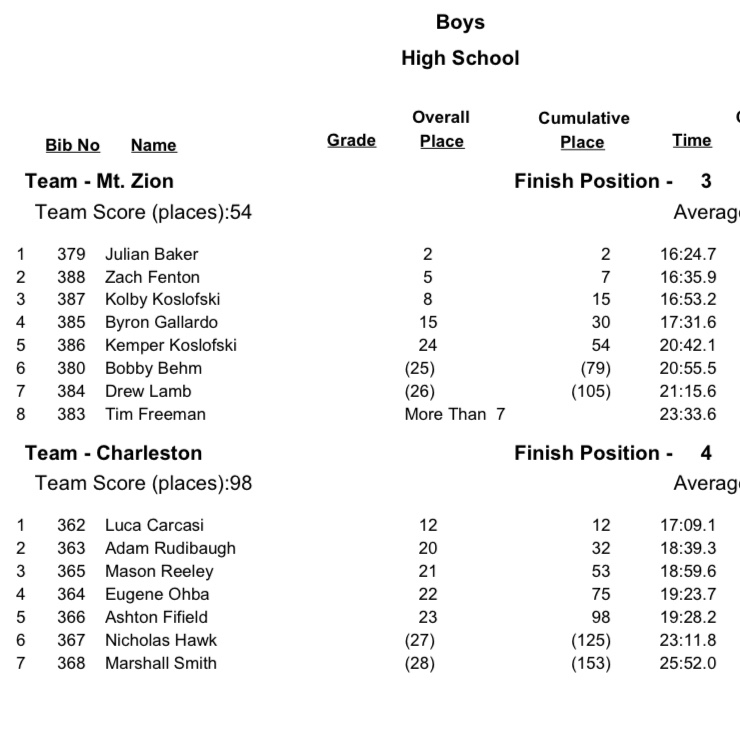 Central finished in second with 44 points, followed by Mt Zion (54) and Charleston (98).