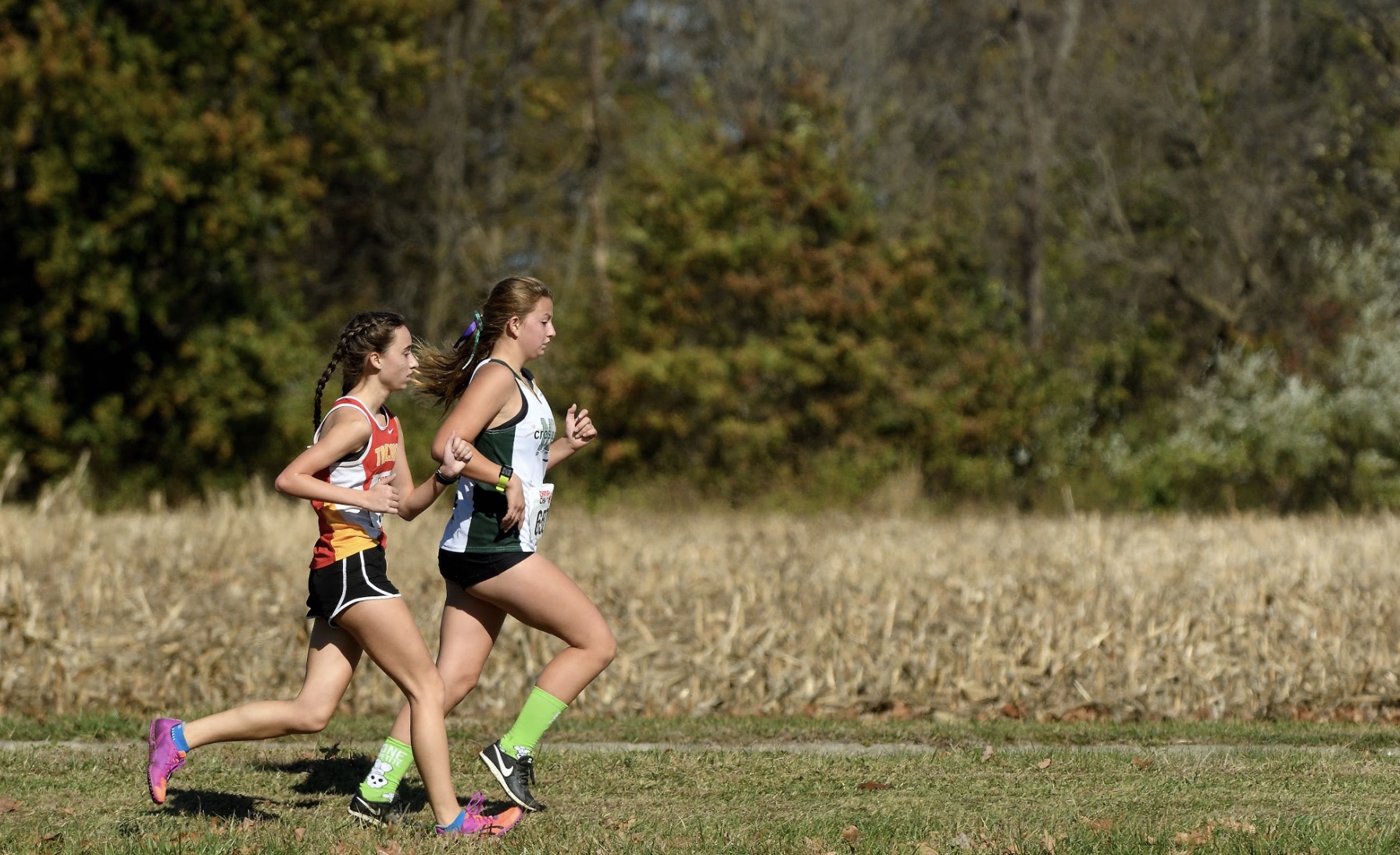 3. Charleston’s Lily Long and Mattoon’s Oakley Layton run side-by-side during the Class 2A Olney cross country sectional Saturday morning. Long finished 77th with a time of 22:39.31 and Layton finished 78th with a time of 22:50.79.
