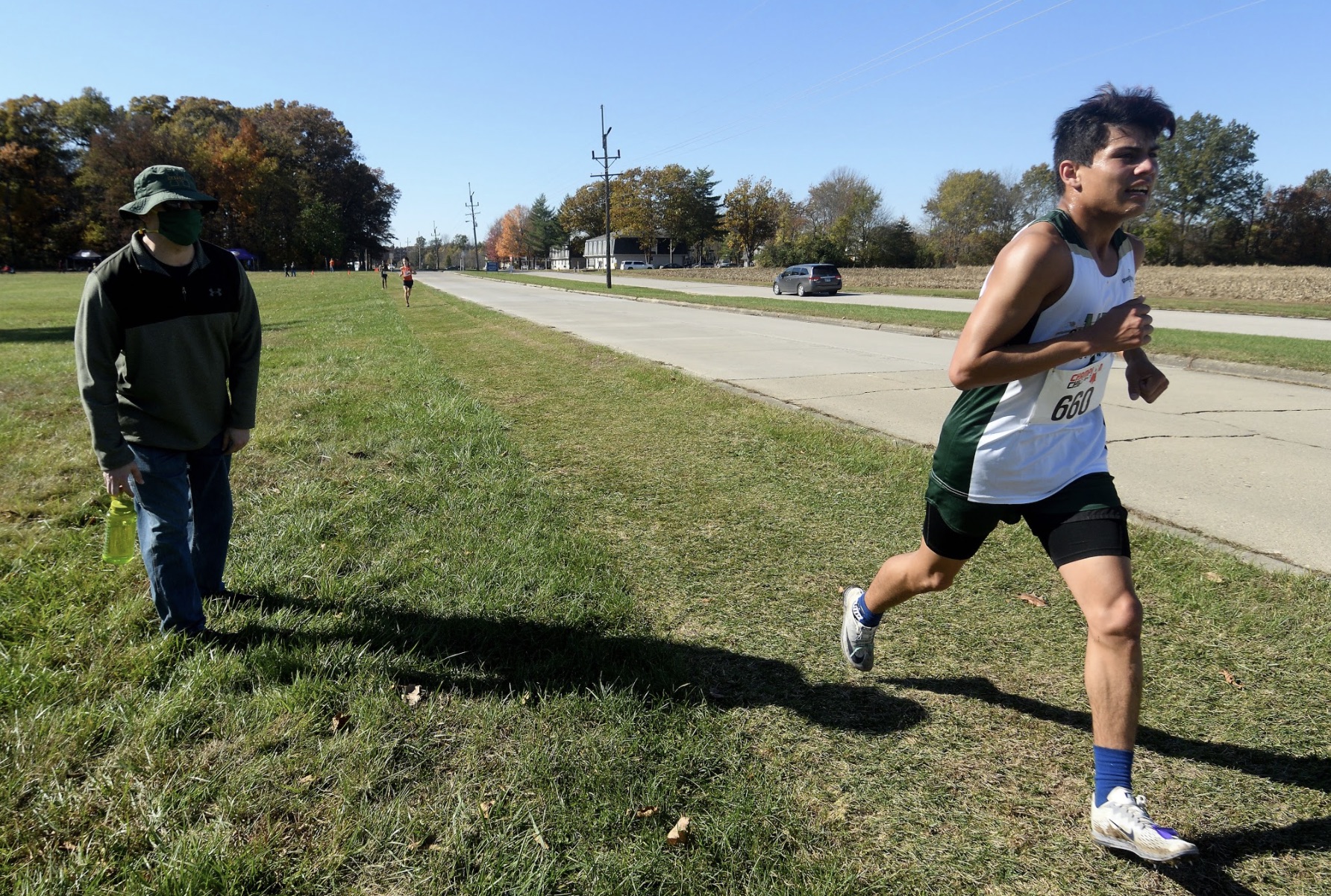 7. Mattoon High School Principal Richard Stuart cheers on his student athlete, Tyler Warner, during the Class 2A Olney cross country sectional Saturday afternoon. Warner finished 86th with a time of 18:17.56.