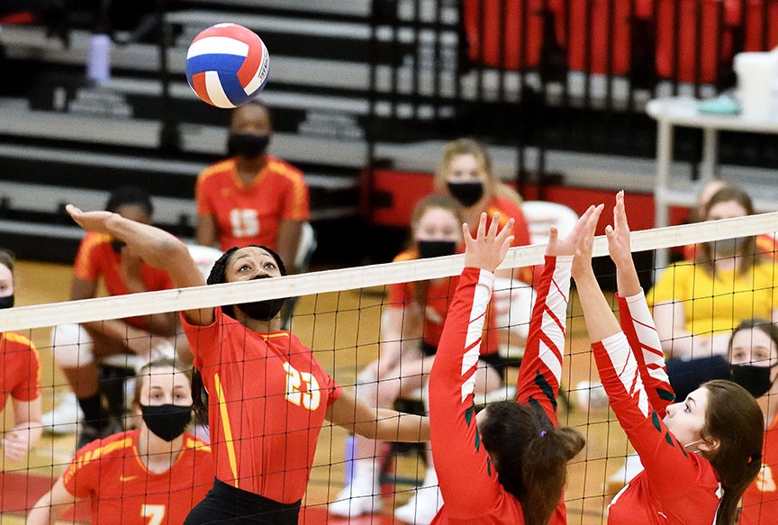 Blase used her reach to block an Effingham kill, gaining a point and serve.