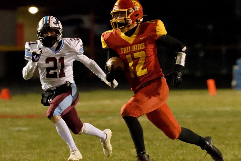 Schuette made things happen on the defensive side on the next possession. Taylorville quarterback Kamren Heimsness dropped back to pass and overshot his receiver. Schuette picked it off and Charleston was in business again with the ball at the Tornadoes’ 43-yard line. The Trojans could not take advantage of the good field position and ending up punting the ball away.