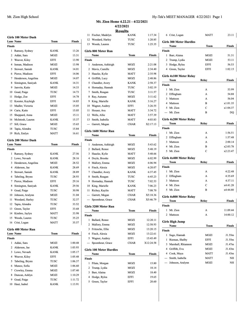 GIRLS TEAM RESULTS