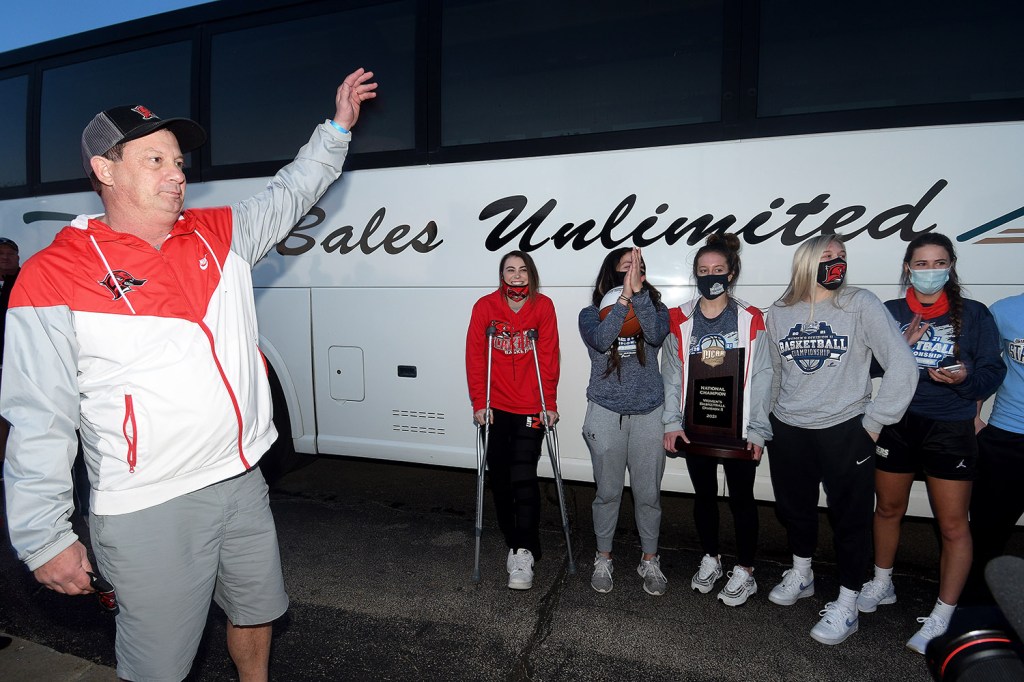 Lake Land women’s basketball coach Dave Johnson got off the team bus Sunday at 7:45 p.m. and held the NJCAA Division II National Championship trophy aloft in front of 100 fans, including several of the LLC sports teams as well as family of the players and others.