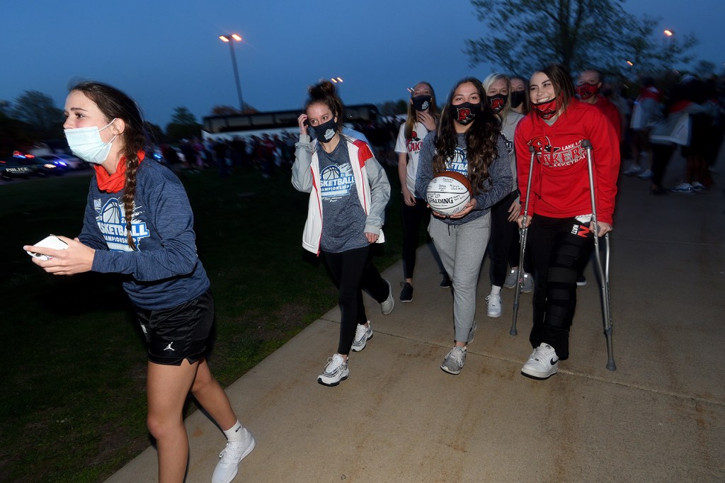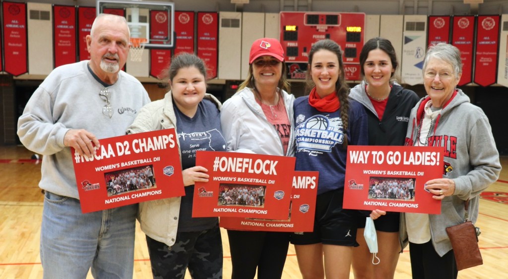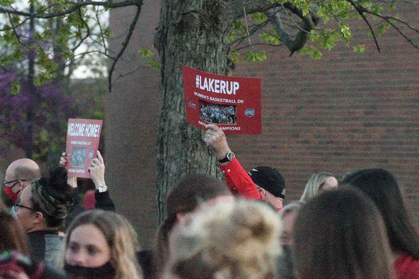 The Lakers arrived a little later than originally planned, but it didn’t matter as the excitement grew the closer the bus came to campus. Posters were passed out with a team photo taken after the game ended. The men’s basketball team had a larger poster with the team photo and welcome home at the top of the poster.