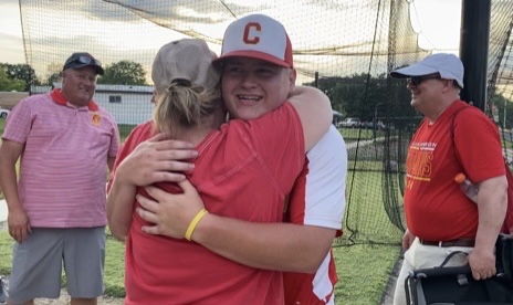 Peyton Daugherty received a congratulatory hug after Charleston’s extra-inning victory Friday evening. (Photo/Chet Piotrowski)