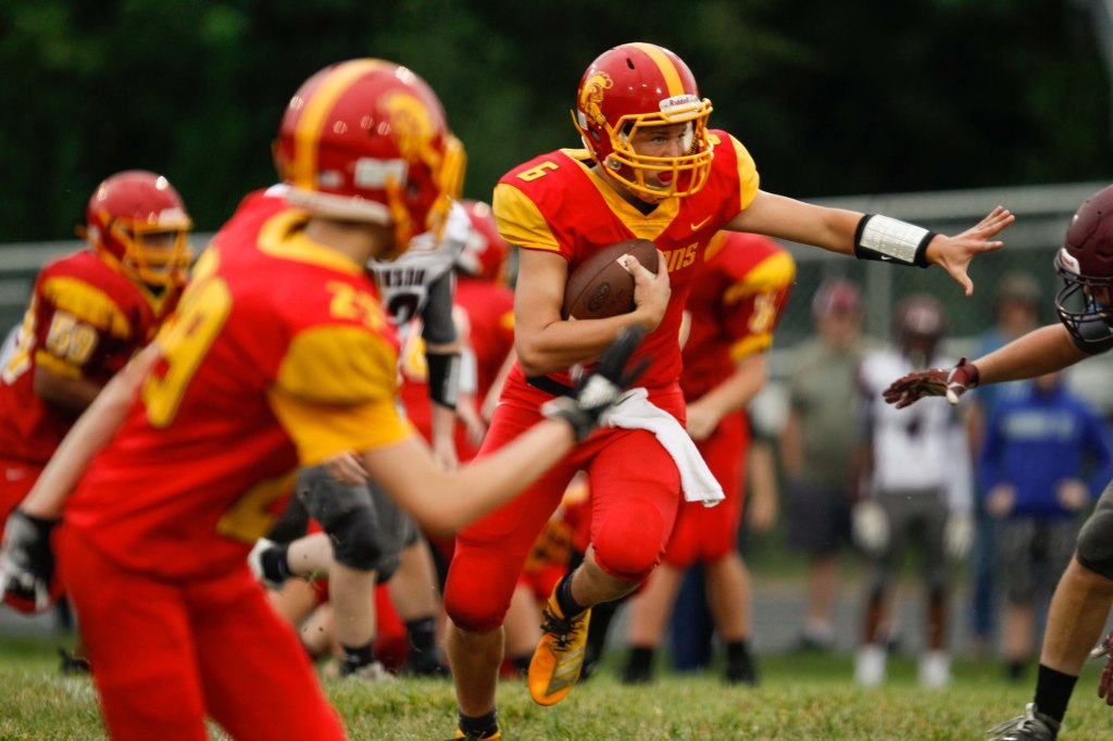 Sophomore quarterback Brett Spour runs the ball during the first quarter of the Charleston JV game against Robinson on Monday. Spour left the game with an injury during the first quarter. (Photo/Dominic Baima)