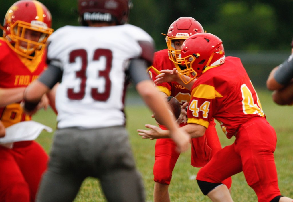 Freshman quarterback Luke Bonnsetter hands off the ball to freshman running back Ben Coffey during the Charleston High School JV football game Monday against Robinson. (Photo/Dominic Baima)