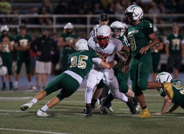 Mattoon defenders attempt to take down the Mt. Zion ball carrier Friday at O’Brien Field. (Photo/Dominic Baima)