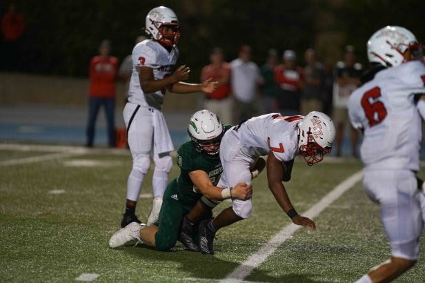 Senior Aidan Spurgeon sacks the Mt. Zion quarterback in the backfield for a loss on the play Friday at O’Brien Field. (Photo/Dominic Baima)
