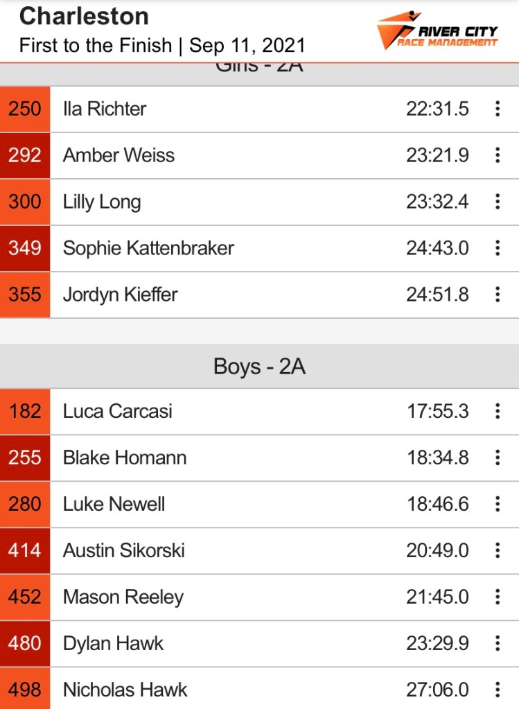 Charleston boys, meanwhile, finished six spots back in 47th. Luke Newell running because he did not have a conflict with soccer, finished in 18:46. Freshman Blake Homann ran a new PR in 18:34.