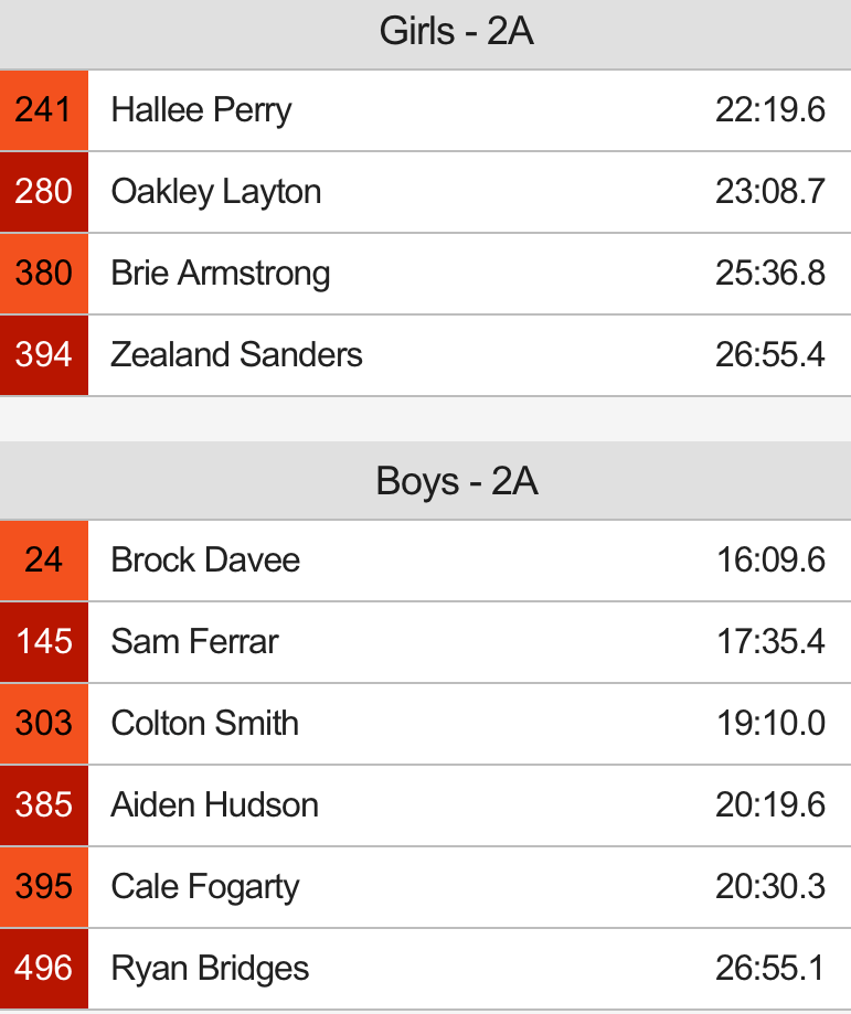 Hallee Perry ran a PR in finishing in 22:19.6 for the Green Wave girls. Charleston’s Ila Richter followed 12 seconds later in 22:31.5, followed by Amber Weiss (23:21.5) and Lilly Long (23:32.4).