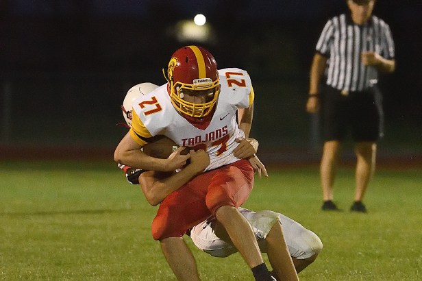 With 57 seconds left in the fourth quarter, Jacob Roe hauled in his third touchdown pass of the night to pull the Trojans to within 26-22 of the Hearts. The two-point conversion failed.