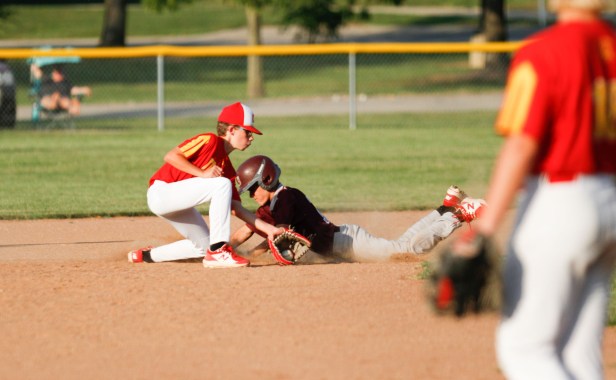 A Tolono Unity runner is tagged out by Charleston’s Ty Helton at second base Monday during the Charleston Middle School 10-0 loss. (Photo/Dominic Baima)