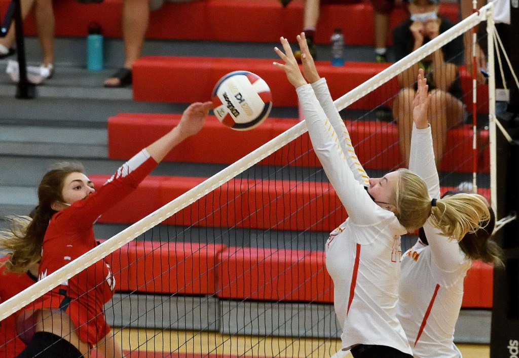 Effingham’s Kennedy Sowell tries to spike the ball between Charleston’s Addison Shrader and Genavieve Braden in the Gold Flight semfinal match of the Charleston Invitational Saturday afternoon. Charleston lost the match 23-25, 22-25 and was seeded into the third place match.