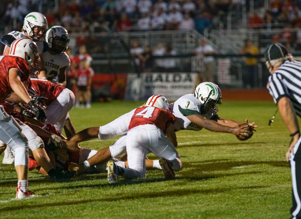 Junior Taeriek Grace dives in for a touchdown during the first quarter Friday at Effingham High School putting Mattoon up 12-0. (Photo/Dominic Baima)