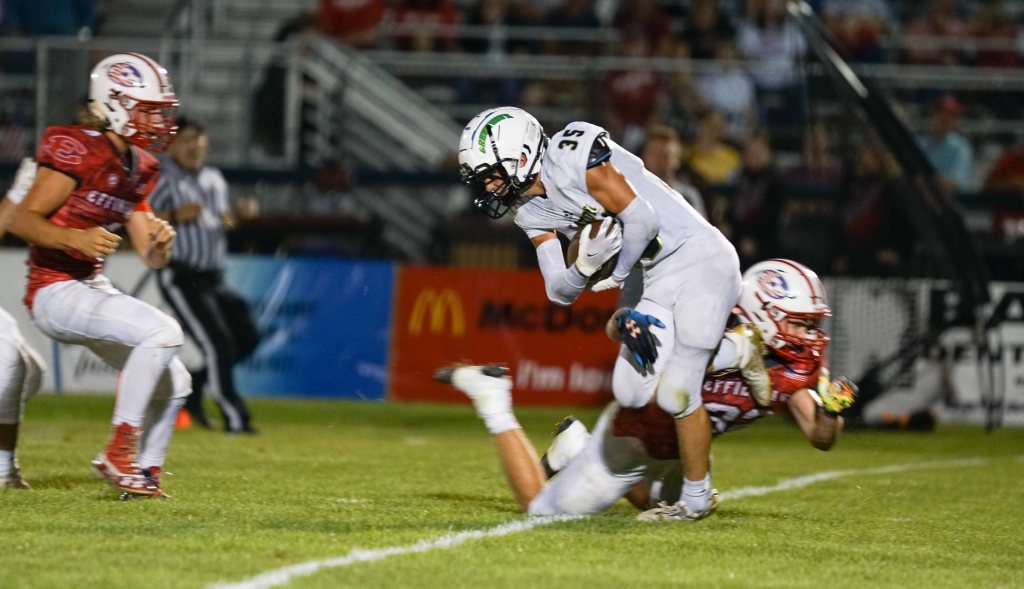 Senior Jackson Spurgeon is forced out of bounds as he dives for a touchdown Friday at Effingham. During the next play Effingham recovered the Mattoon fumble to end the drive. (Photo/Dominic Baima)