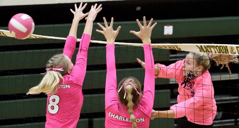 Mattoon’s Bella Smith spikes the ball past Charleston’s Macy Hetzel and Audrey Jacobs. (Photo/Chet Piotrowski)