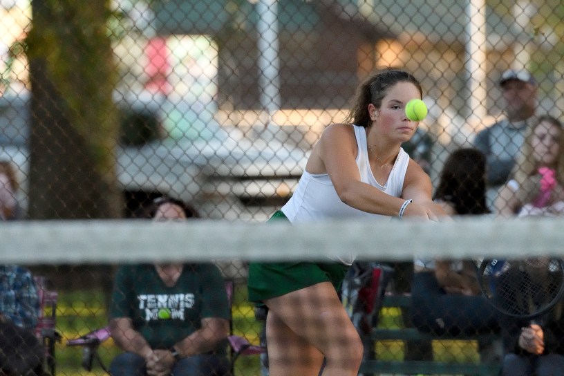 Mattoons Caroline Davis looks to make a return in front of her #1 doubles partner Annalise Overmyer against St. Anthony’s Emily Kowalke and Ali Adams Tuesday evening at Lytle Park.