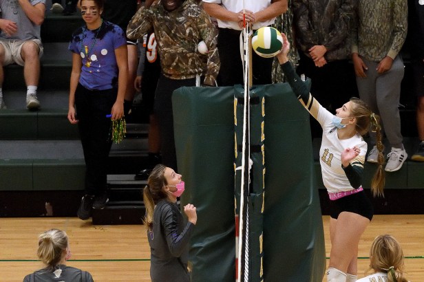 Mattoon’s student section stormed the court after the Green Wave volleyball team used a strong defense to sweep Springfield Sacred Heart-Griffin 25-21, 25-19 Thursday for Senior Night.