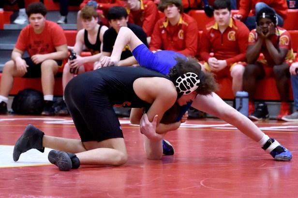 And freshman Stormy Hughes continued to shake off the wildness evident earlier this season by pinning his Effingham opponent in 1:19 Tuesday and going 2-1 on Wednesday. Hughes pinned his St. Thomas More opponent in 1:27, won by forfeit and then lost in 1:39 to a Cumberland wrestler.