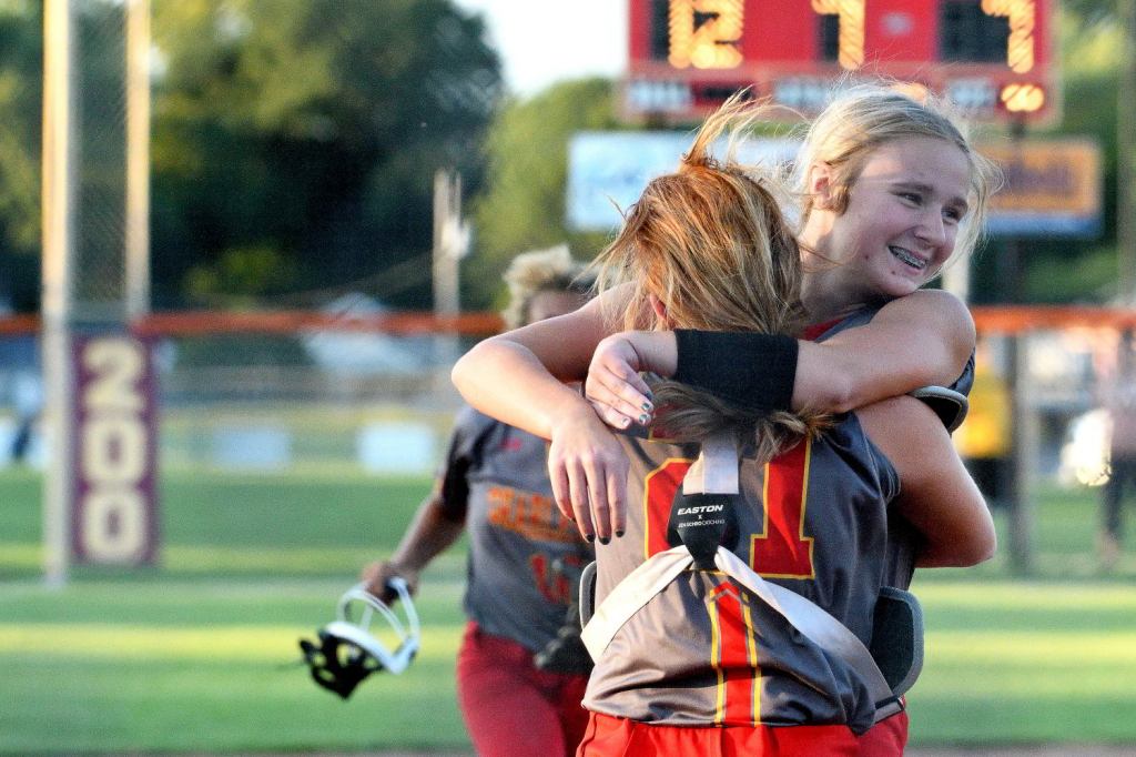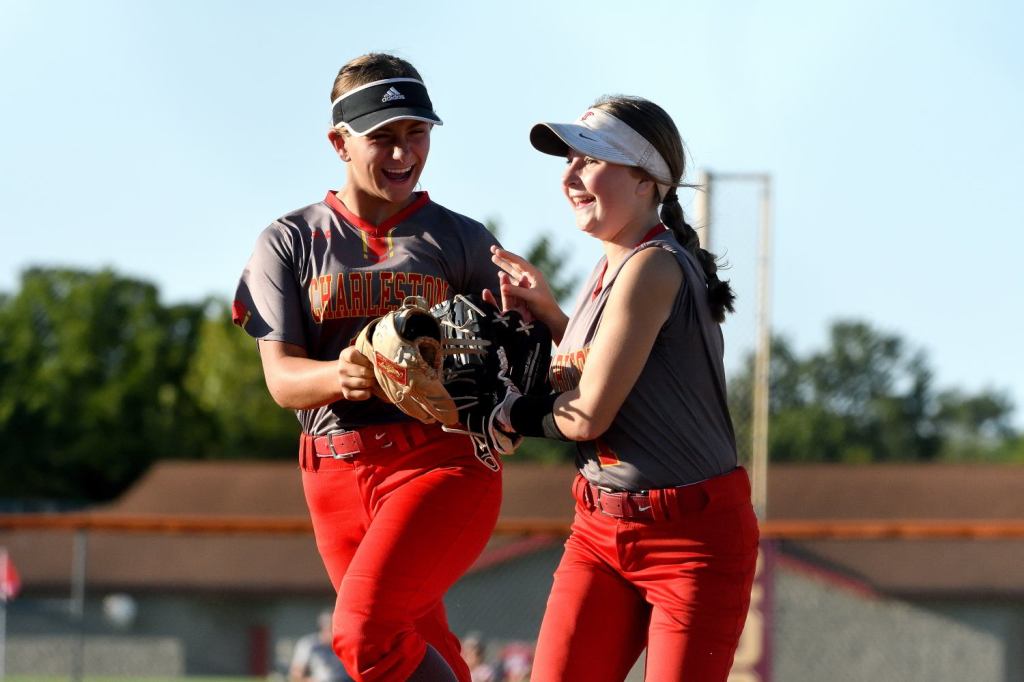 Charleston Middle School’s Ella Price hugs Heighden Fairley as the Trojans defeated Effingham Junior High School, 12-7, to capture the IESA Class 3A Regional championship at Charleston Tuesday afternoon.Charleston’ Middle School’s Raylin Cox throws to first base during the Trojans 12-7 win over Effingham Junior High School during the IESA Class 3A Regional championship at Charleston Tuesday afternoon.