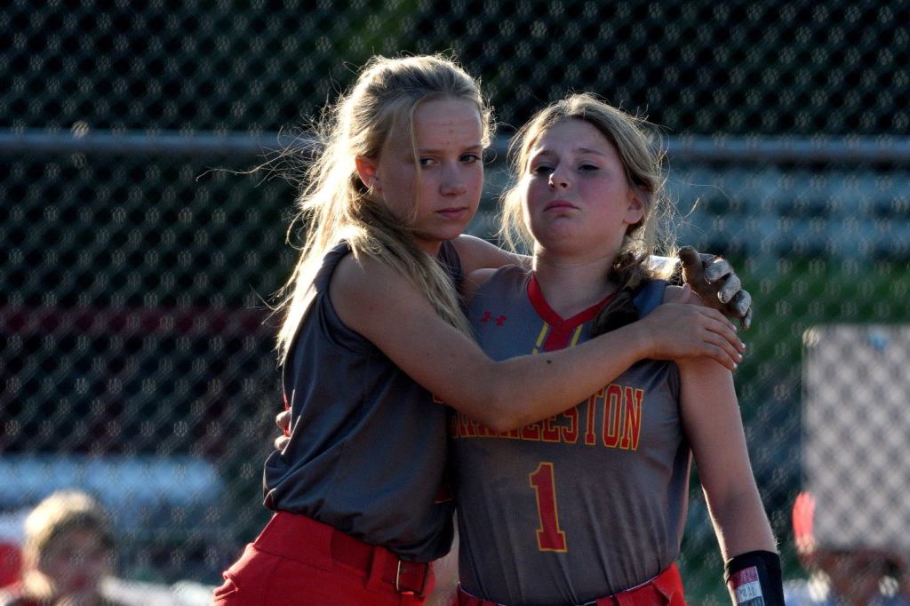 Charleston Middle School’s Ella Price fires a pitch to an Effingham Junior High School batter during the Trojans 12-7 win over Effingham Junior High School during the IESA Class 3A Regional championship at Charleston Tuesday afternoon.Charleston Middle School’s Lainie Keefer consoles Rylee Lewis after after the centerfielder collided with Effingham Junior High School’s Keagyn Koenig at home plate during the Trojans 12-7 win over Effingham Junior High School during the IESA Class 3A Regional championship at Charleston Tuesday afternoon. Lewis remained out of the game with a wrist injury.
