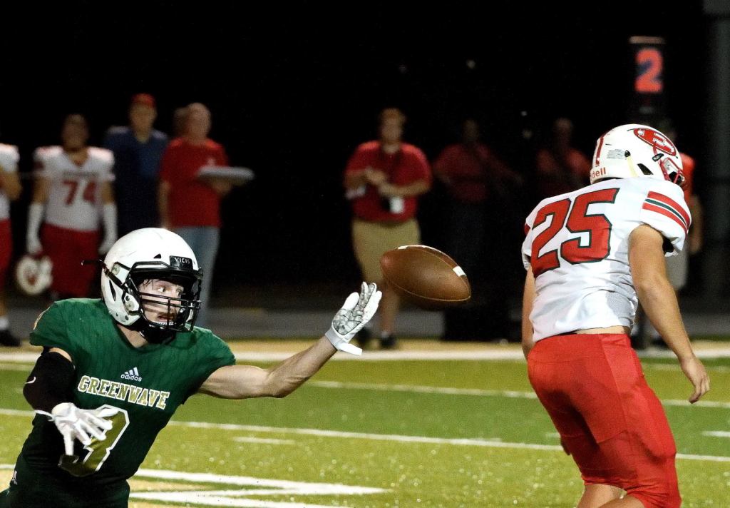 Mattoon’s Taerick Grace (9) collides with Effingham’s London Rinkel with Spencer Fox on his back during the Hearts 34-0 victory at Gaines Field Friday evening.Effingham’s Jack Harper deflects a pass intended for Mattoon’s Owen Hawkins during the Hearts’ 34-0 victory over the Green Wave at Gaines Field Friday evening.