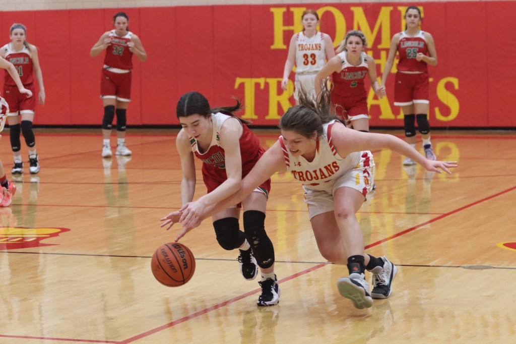 Freshman Grace Schneider and sophomore Annie Logsdon both fight for possesion of the ball at the Lincoln Railspliiters vs. Charleston Trojans game at Charleston High School, Saturday afternoon on Dec. 10, 2022, in Charleston, Ill.