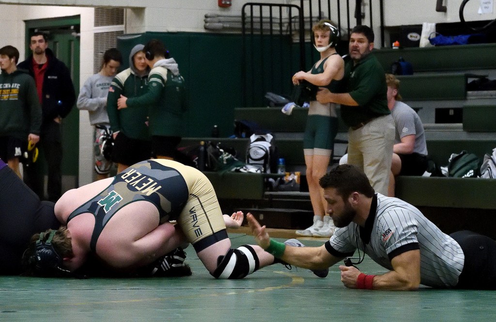 Seniors Logan Blackburn, TJ Owens, and Leo Meyer all won their respective matches by pin, while Jason Skocy won one and lost another by decision. Meyer wrestled at 285 against Oakwood for his first win of the night, then came back and won at 220 against Lawrenceville for his second.