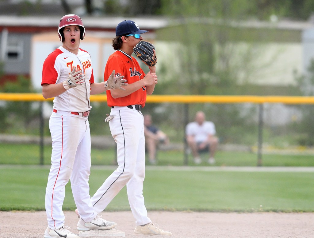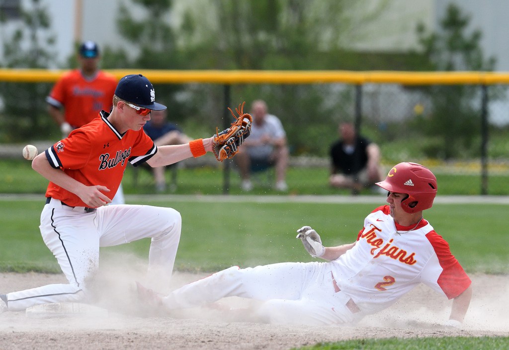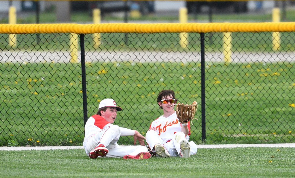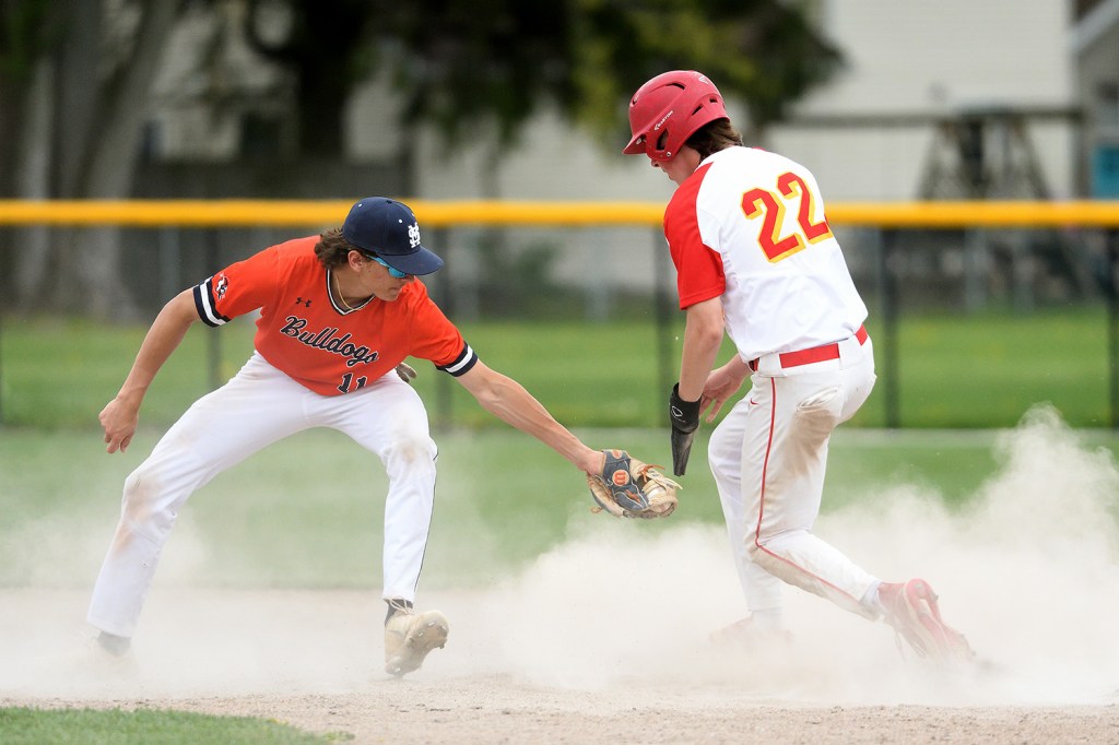 Bulldogs centerfield, Carter Selk, drilled a ball to left center field. Caden Pruett called off James Hess. Hess called off Pruett. The two collided and went down in a heap. Hess looked up at his left fielder who held his glove in the air signaling he caught the ball.