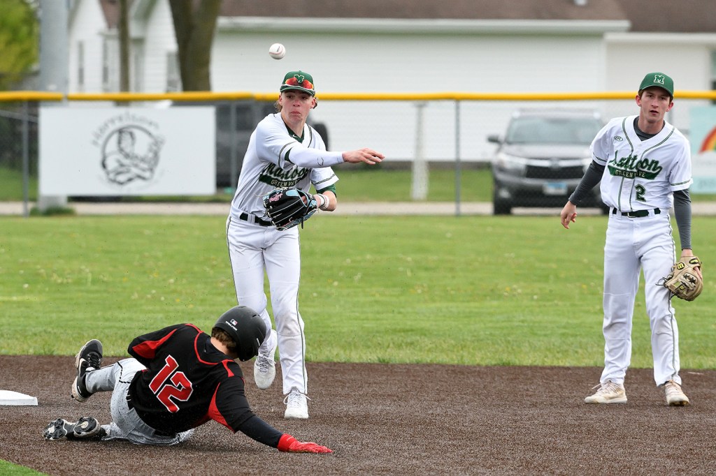 After issuing a walk to Mt. Zions’ Brendan Doyle, Helms got Mt. Zion’s Robert Chausse to hit into a double play, with Luke Perry tossing the ball to Johnson for the out at second and the throw to Knierem at first.