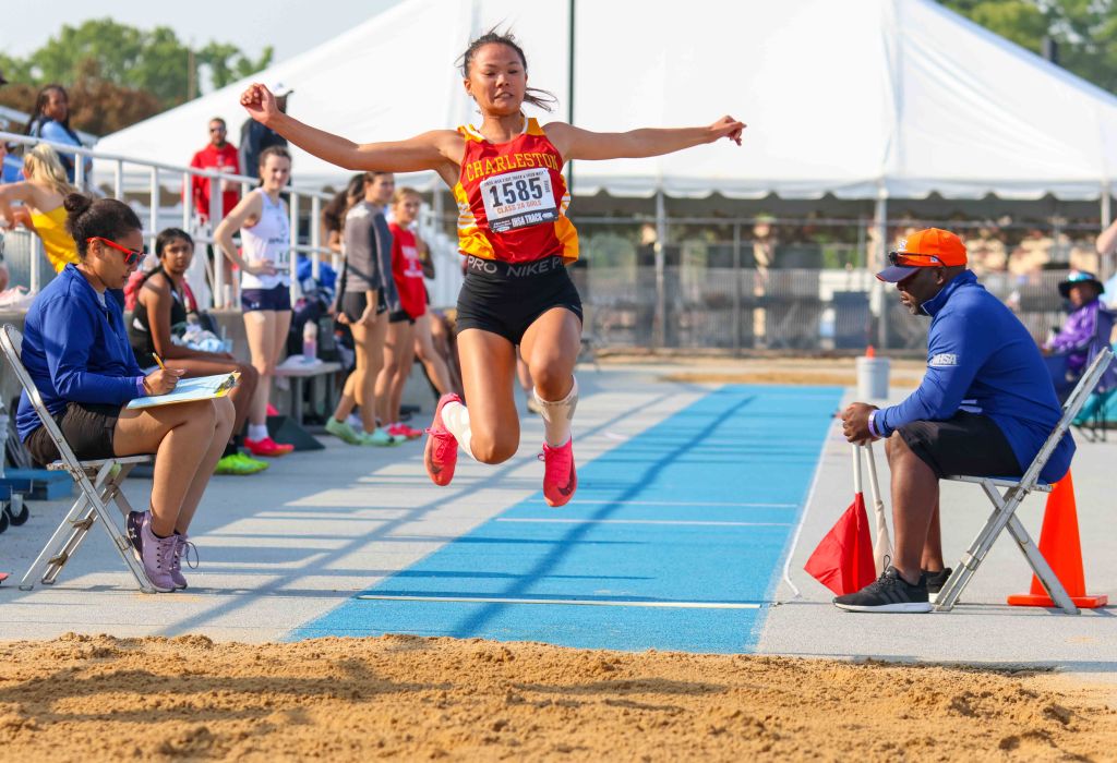 Charleston junior Olivia Conn finished 25th overall with her first jump of 4.74m, her farthest of the day. (Photo/Dominic Baima)
