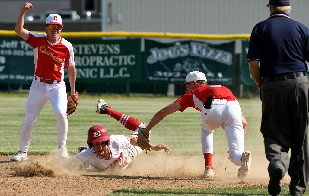 In the fifth inning, Charleston first baseman James Hess raced to the fencing and caught a foul ball by Raddatz. Moments later with Effingham’s Quest Hull on first from a walk, the Trojans almost pulled off a double play with third baseman Spour firing to Sipes at second then to Hess at first, a step behind Myles Maxedon, who beat the throw.
